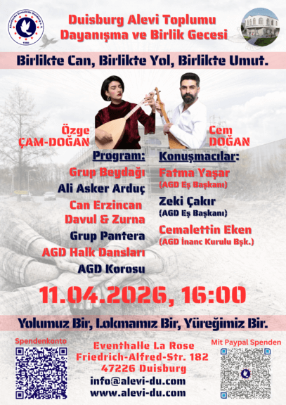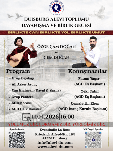 Duisburg Alevi Toplumu olarak yeni inşaatımız için düzenlediğimiz Dayanışma ve Birlik Gecesine sizleri ve dostlarınızı davet ediyoruz.